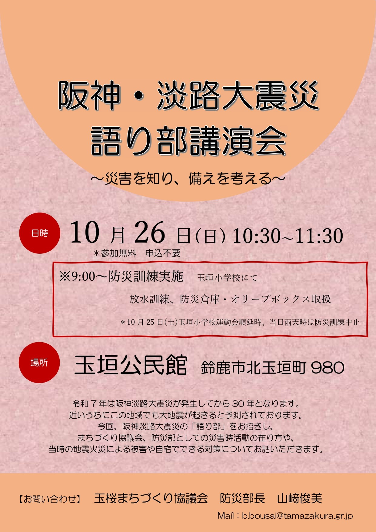 令和7年10月26日(日)10時30分より玉垣公民館にて神戸市より語り部をお招きして講演会を行います。